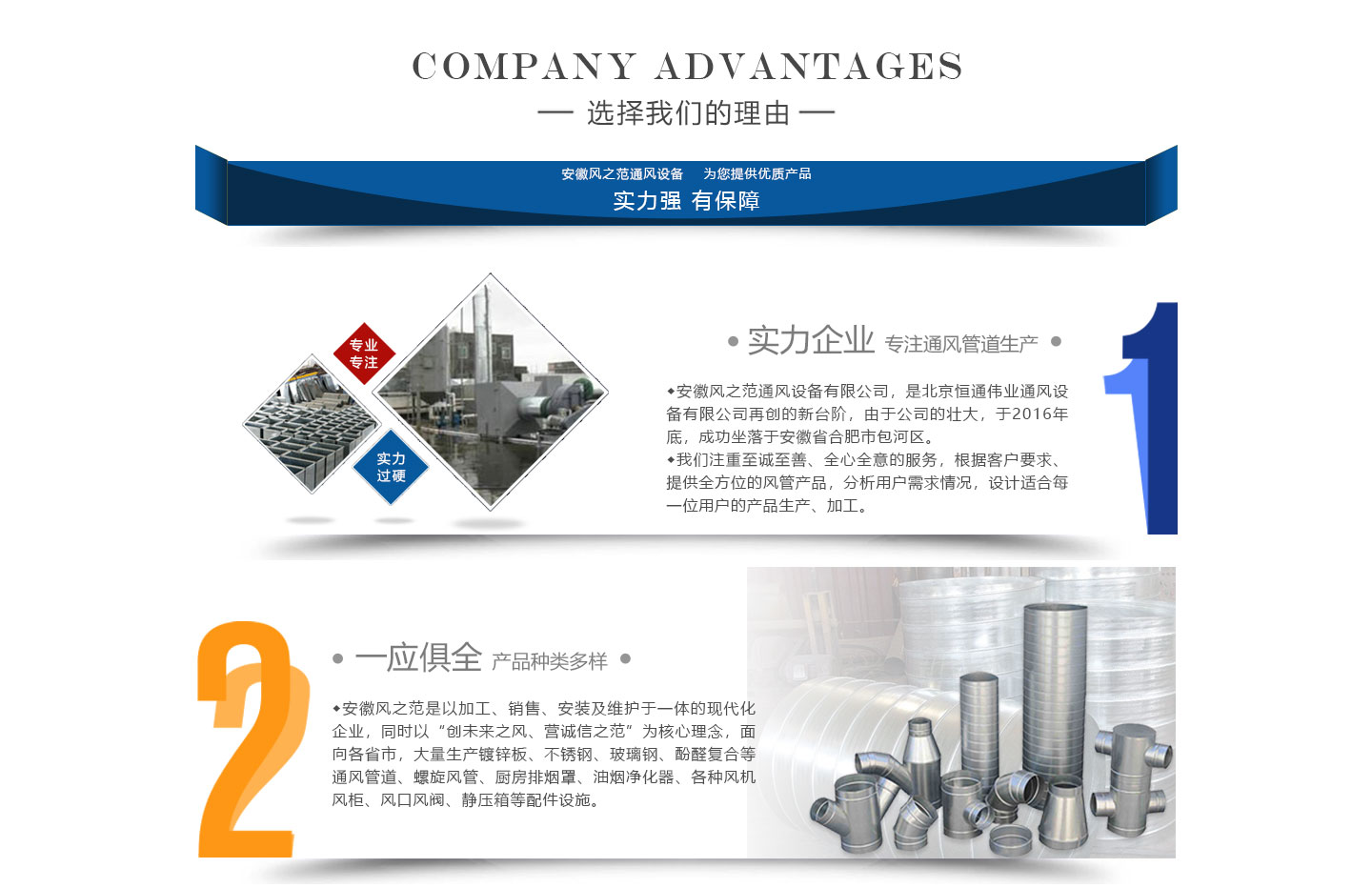 安徽風(fēng)之范通風(fēng)設(shè)備有限公司,是北京恒通偉業(yè)通風(fēng)設(shè)備有限公司再創(chuàng)的新臺(tái)階,多年來(lái),公司員工憑著“誠(chéng)信敬業(yè)、團(tuán)結(jié)拼搏、勇于開(kāi)拓、務(wù)實(shí)進(jìn)取”的企業(yè)精神,先后承接了多項(xiàng)重點(diǎn)工程項(xiàng)目,使公司健康穩(wěn)步發(fā)展。現(xiàn)由于公司的壯大,業(yè)務(wù)的拓展,又于2016年底,成功坐落于安徽省合肥市包河區(qū)。本公司生產(chǎn)設(shè)備精良,技術(shù)力量雄厚,質(zhì)保體系完善!讓用戶體驗(yàn)到,貼心的服務(wù),無(wú)憂的售后!風(fēng)之范是以加工、銷售、安裝及維護(hù)于一體的現(xiàn)代化企業(yè),同時(shí)以“創(chuàng)未來(lái)之風(fēng)、營(yíng)誠(chéng)信之范”為核心理念,面向全國(guó)各省市,大量生產(chǎn)鍍鋅板、不銹鋼、玻璃鋼、酚醛復(fù)合等通風(fēng)管道、螺旋風(fēng)管、廚房排煙罩、油煙凈化器、各種風(fēng)機(jī)風(fēng)柜、風(fēng)口風(fēng)閥、靜壓箱等配件設(shè)施。廣泛承接商場(chǎng)、工廠、酒店、寫字樓、地下室等,消防排煙工程、除塵凈化工程、室內(nèi)通風(fēng)工程、暖通空調(diào)工程、廚房排煙凈化工程。我們力求上進(jìn),追求,歡迎各界人士技術(shù)指導(dǎo),經(jīng)濟(jì)合作,共創(chuàng)美好明天!